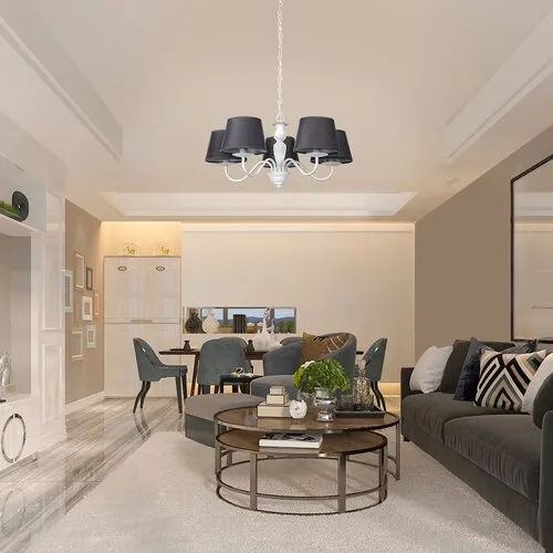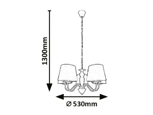 A Flavio függeszték jellegzetes formájával és vintage stílusával nappalink berendezésének meghatározó darabja lehet. A lámpa ívelt ágai henger alakú, lefelé enyhén szélesedő, egyszerű búrákban végződnek. A fehér színű váz anyaga fém, a szürke lámpaernyő pedig textilből készült. A sötét színű búrák alól finoman kiszűrődő fény csodás megvilágítással látja el az adott helyiséget. Az elegáns hangulat megteremtéséhez javasoljuk a természetes fehér fényű, gyertya alakú fényforrások használatát. A Flavio öt darab, egyenként legfeljebb 40 W teljesítményű fényforrással használható, a foglalatok típusa E14. A függeszték méretei a következők: átmérője 530 mm, belógása 1300 mm. Ezt a romantikus modellt fényforrások nélkül szállítjuk.
