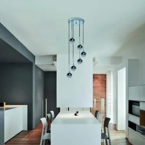 A fémből és üvegből készült Semira hatos függesztéket azoknak ajánljuk, akik kedvelik az ötletes formatervezésű, mégsem hivalkodó lámpákat. Stílusát tekintve a modern kategóriába sorolható. A Semira krómszínű, fém testét hat darab füstszínű üvegbúra és nagyméretű, kerek, krómszínű dísztalp egészíti ki. Az eltérő magasságban függő, szabályos, gömb alakú búrák igen látványos világítási megoldást kínálnak. A Semira hat darab, egyenként legfeljebb 4 W teljesítményű fényforrással használható, a foglalatok típusa E14. Választhatunk hozzá természetes vagy meleg fehér színű fényforrásokat, attól függően, hogy melyik áll közelebb az ízlésünkhöz. A Semira függesztéket elsősorban tágas, modern nappalikba ajánljuk, ahol sejtelmes fényével különleges hangulatot varázsolhat estéinkbe. A termék csak energiatakarékos izzóval használható. A hatos függeszték méretei a következők: átmérője 410 mm, belógása 1200 mm. Ezt a modellt fényforrások nélkül szállítjuk.