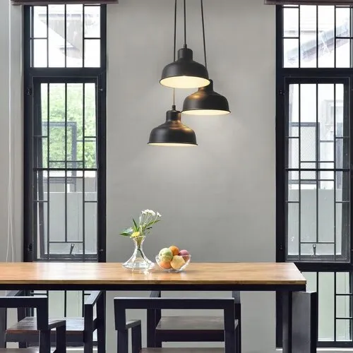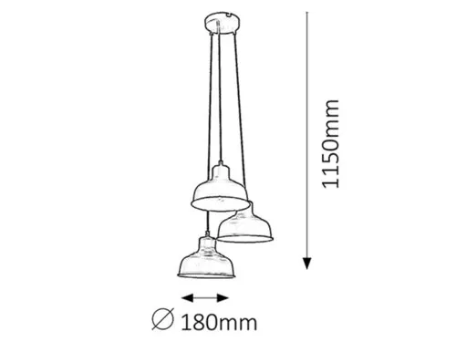 Indusztriális stílusú függeszték 3 db foglalattal. 115 cm lelógású, matt fekete színű test és 18 cm átmérőjű lámpabúrák. A lámpatest E27-es foglalatkialakítású, max. 3x 25W teljesítményű energiatakarékos fényforrásokkal is használható.