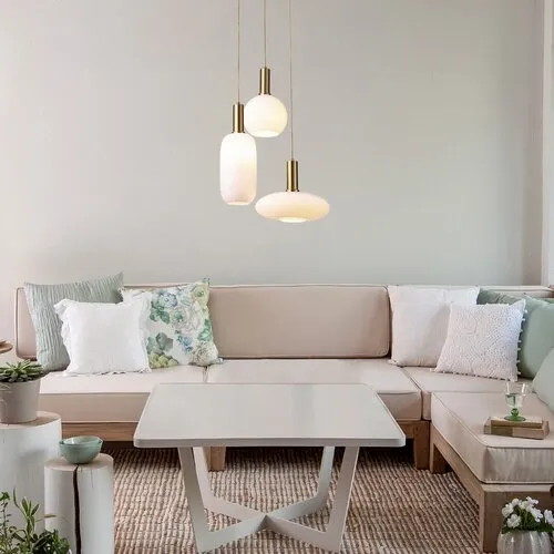 A klasszikus stílus képviselői közé tartozó Sinopia hármas függeszték nappalink vagy hálószobánk berendezésének elegáns, egyszersmind figyelemfelkeltő darabja lehet. Az aranyszínű lámpatesthez eltérő magasságban függő lámpafejek kapcsolódnak, amelyeket különböző formájú, opál üvegbúrák borítanak. Az egyik hosszúkás, palack formájú, a másik gömb, a harmadik lapított gömb alakú. A lámpa nagyméretű, kerek dísztalp segítségével rögzíthető a mennyezetre, a lámpafejeket textil tartókábelek kötik össze a dísztalppal. A függeszték három darab, egyenként legfeljebb 60 W teljesítményű fényforrással használható, a foglalatok típusa E27. Ha meghitt, otthonos hangulatot szeretnénk teremteni a szobában, válasszunk hozzá meleg fehér fényű fényforrásokat. A Sinopia hármas függeszték méretei a következők: szélessége 400 mm, a lámpa belógása 1300 mm, beépítési átmérője 300 mm. Ezt a modellt fényforrások nélkül szállítjuk.