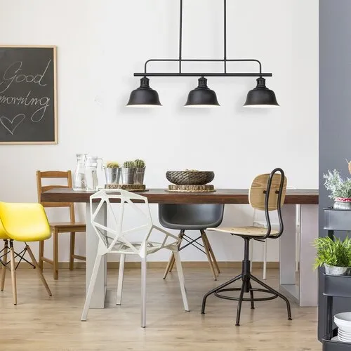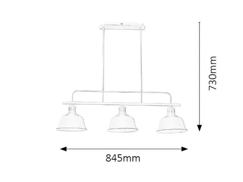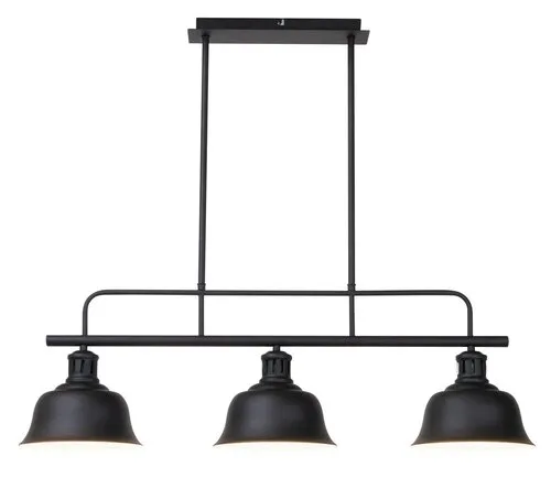 Indusztriális stílusú függeszték 3 db foglalattal. 73 cm lelógású és 84,5 cm széles, matt fekete színű fémből készített szerkezet és lámpabúrák, IP20-as védettséggel. A lámpatest E27-es foglalatú, 3x max. 60W teljesítményű energiatakarékos izzókkal is használható.