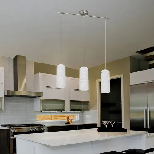 Modern megjelenésű függeszték 3 darab foglalattal. 62.5 cm-es szélesség, 110 cm-es fix lelógás, szatin króm színű szerkezet és 10 cm átmérőjű, fehér alapszínű, csíkos mintás üvegbúrák, IP20-as védelemmel. A lámpatest E27-es foglalatú, max. 3x 60W teljesítményű, halogén vagy LED izzókkal is használható.