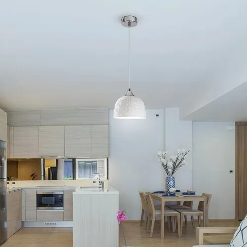 A vintage stílusban készült, gyönyörű Rosalie függesztéket elsősorban az étkezőbe vagy a konyhába ajánljuk. A fémből és kerámiából készült, fehér színű modell ernyő formájú búráját csodaszép rózsaminta díszíti, amit a búra domború felülete tesz még különlegesebbé. A kerek dísztalppal szerelt, romantikus megjelenésű Rosalie egy darab, legfeljebb 40 W teljesítményű (energiatakarékos) fényforrással használható, a foglalat típusa E27. Ha otthonos, meghitt hangulatot szeretnénk teremteni az adott helyiségben, válasszunk hozzá meleg fehér színű fényforrást. A lámpa búrájának átmérője 154 mm, a függeszték belógása 1140 mm. A Rosalie függesztéket fényforrás nélkül szállítjuk.