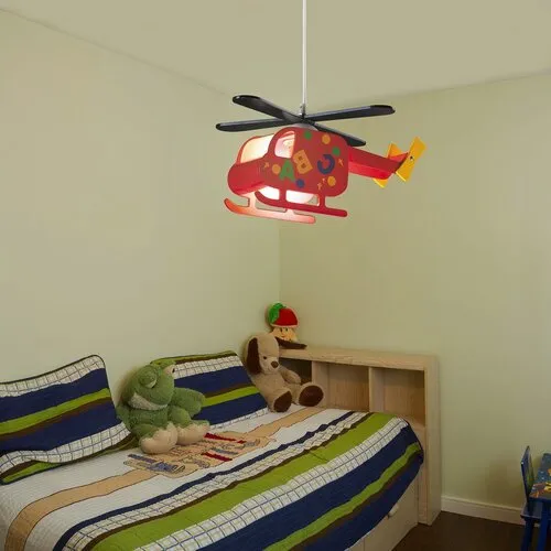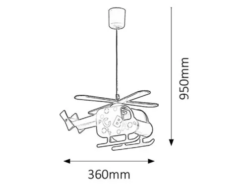 Gyerekszobai függeszték 1 db foglalattal, helikopter formájú, 36 cm széles, színes lámpabúrával. Műanyag lámpatest, 95 cm lelógású, fix kivitel. A gyerek lámpa E27-es foglalatú, max. 40W teljesítményű halogén és energiatakarékos fényforrással használható.