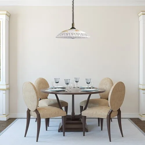 Időtlen megjelenésű, állítható lelógású függeszték 1 db foglalattal. Maximum 120 cm lelógású, 40 cm búraátmérőjű, barna színű lámpatest fehér alapszínű, barna és arany mintás alabástromüveg lámpabúrával. A lámpatest E-27-es foglalatú, max. 60W teljesítményű energiatakarékos fényforrással is használható.