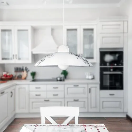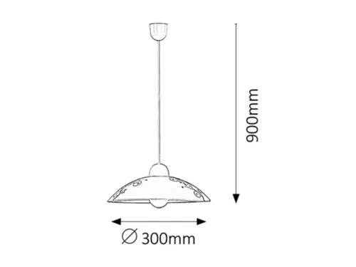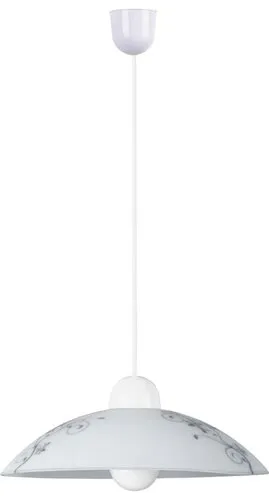 Romantikus megjelenésű függeszték, 30 cm átmérőjű, mintás üvegbúrával. Fix vezetékezés, 90 cm-es hosszúság, fehér üveg lámpabúrával, fekete virágmintával. Használható valamennyi E27-es, maximum 60W teljesítményű, halogén vagy LED fényforrással. Kialakításának köszönhetően a fényforrás cseréje, illetve a lámpatest tisztítása gyorsan és egyszerűen elvégezhető.