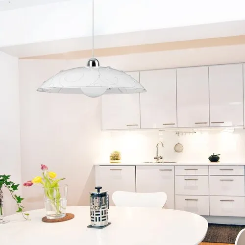 Időtlen megjelenésű függeszték, 40 cm átmérőjű, 3D hatású mintás, üveggyöngyözött üvegbúrával. Fix vezetékezés, 90 cm-es hosszúságú, fehér és króm színű. Használható valamennyi E27-es, maximum 60W teljesítményű, halogén vagy LED fényforrással. Kialakításának köszönhetően a fényforrás cseréje, illetve a lámpatest tisztítása gyorsan és egyszerűen elvégezhető.