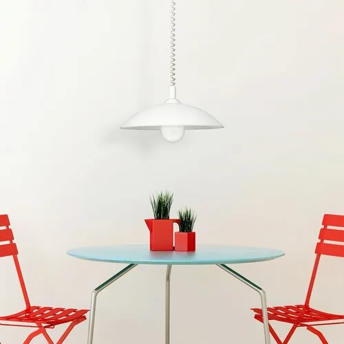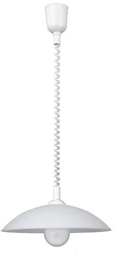 Időtlen megjelenésű függeszték 1 db foglalattal. Állítható, de maximum 120 cm lelógású, 40 cm átmérőjű, fehér színű műanyagból készített függeszték és üveg lámpabúra, IP20-as védelemmel. A lámpatest E27-es foglalatkialakítású, max. 60W teljesítményű energiatakarékos fényforrással is használható.