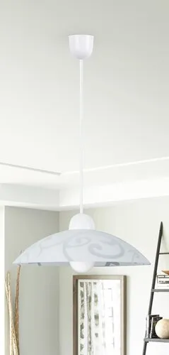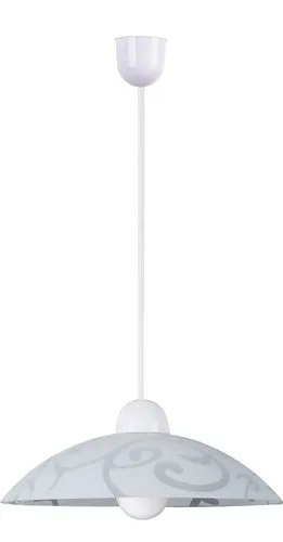 Időtlen megjelenésű függeszték, 30 cm átmérőjű, mintás üvegbúrával. Fix vezetékezés, 90 cm-es hosszúságú, fehér és áttetsző színű. Használható valamennyi E27-es, maximum 60W teljesítményű, halogén vagy LED fényforrással.