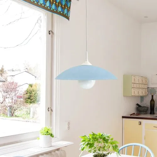 Időtlen megjelenésű függeszték. Fix kivitelű, 90 cm-es, fehér színű műanyag függesztékkel és 32.5 cm-es átmérőjű, íves kialakítású, kék színű üvegbúrával. A lámpatest E27-es foglalatú, max. 60W teljesítményű energiatakarékos fényforrással használható.