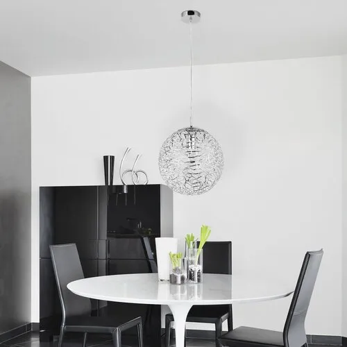 Modern megjelenésű függeszték 1 db foglalattal. 140 cm lelógású, 30 cm búraátmérőjű, króm színű, fémből készített lámpatest és lámpabúra. A lámpatest E-27-es foglalatú, max. 60W teljesítményű energiatakarékos fényforrással is használható.