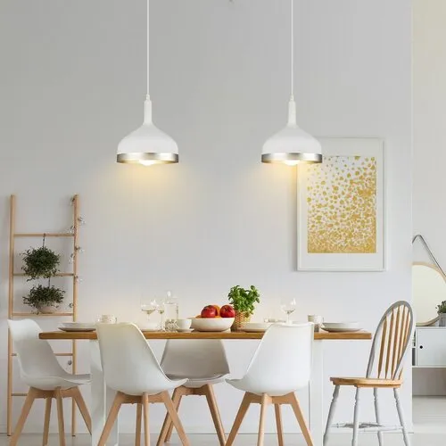 Indusztriális stílusú függeszték 1 db foglalattal. 125 cm lelógású, 20 cm átmérőjű, matt fehér színű fém test matt fehér és ezüst csíkos színű lámpabúrával. A lámpatest E27-es foglalatkialakítású, max. 60W teljesítményű energiatakarékos fényforrással is használható.