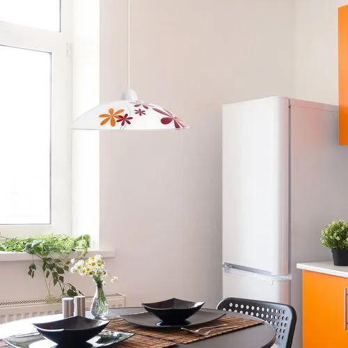 Időtlen megjelenésű függeszték 1 db foglalattal. 90 cm lelógású, 30 cm átmérőjű, fehér színű műanyagból készített függeszték és színes mintás üveg lámpabúra, IP20-as védelemmel. A lámpatest E27-es foglalatú, max. 60W teljesítményű energiatakarékos fényforrással is használható.