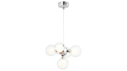 Modern megjelenésű függeszték 5 db foglalattal és fényforrásokkal. 105 cm lelógású, 31,5 cm széles, króm színű fém lámpatest és üveg lámpabúrák. A lámpatestben elhelyezett fényforrások 5x 28W teljesítmény mellett 370 lumen fényerőt és 2700 Kelvines, melegfehér színű fényt biztosítanak. Fényforráscsere esetén a lámpatest G9-es foglalatú, max. 5x 28W teljesítményű energiatakarékos fényforrásokkal is használható.