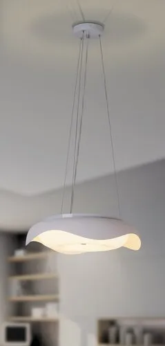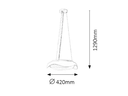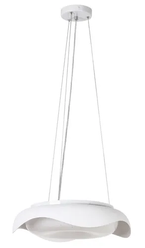 Modern megjelenésű függeszték változtatható fényerejű, beépített energiatakarékos LED izzóval. 129 cm lelógású és 42 cm átmérőjű, fémből és műanyagból készített szerkezet fehér színben, IP20-as védettséggel. A fali kapcsolóval szabályozható fényerejű LED izzó A energiaosztályú, teljesítménye 18W, amelyhez 1260 lumen fényerő társul. Színhőmérséklete melegfehér (3000 Kelvin). A lámpatestben a izzó nem cserélhető. 5 év garanciával!