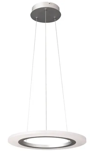 Minimalista stílusú függeszték beépített energiatakarékos LED fényforrással. 120 cm lelógású, 40 cm átmérőjű, ezüst színű, fém és műanyag kombinációjú szerkezet IP20-as védettséggel. A függesztékbe beépített LED fényforrás A energiaosztály besorolású és 20W teljesítmény mellett 1200 lumenes fényerőt, valamint 4000 Kelvines, természetes fehér színű fényt biztosít. 5 év garanciával. A lámpatestben a fényforrás nem cserélhető.