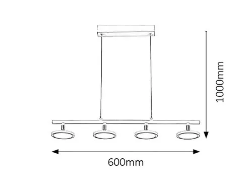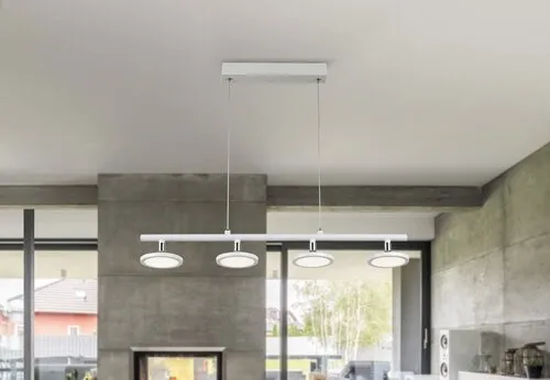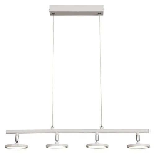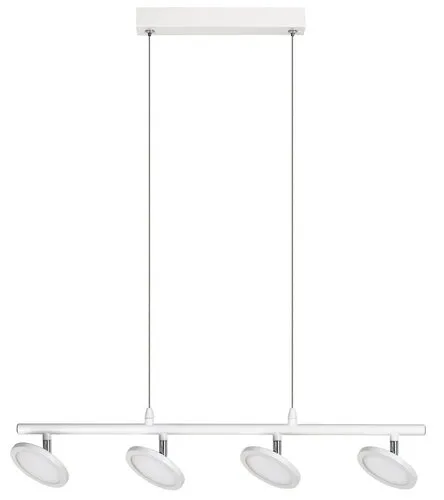 Minimalista stílusú függeszték beépített energiatakarékos LED fényforrásokkal. 100 cm lelógású, 60 cm széles, matt fehér és króm színű, fém és műanyag kombinációjú szerkezet IP20-as védettséggel. A lámpatestben elhelyezett LED fényforrások A+ energiaosztály besorolásúak. 4x 6W teljesítmény mellett 4x 420 lumenes fényerőt, továbbá 4000 Kelvines, természetes fehér színű fényt adnak. 5 év garanciával. A lámpatestben a fényforrások nem cserélhetők.