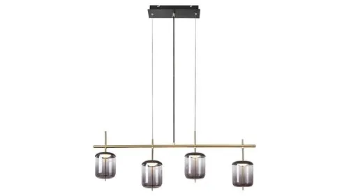 A fém és üveg kombinációjából készült Delice négyes függeszték igazán különleges darabja lehet modern otthonunk berendezésének. Akár a nappaliban, akár az étkezőben kap helyet ez a lenyűgöző modell, vendégeink biztosan nem fognak szó nélkül elmenni mellette. A fekete és bronz színű, fém lámpatestet füstszínű üvegbúrák és téglalap alakú, fekete dísztalp egészítik ki. A Delice sötét színű búrái alól finoman szűrődik ki a fény, sajátos atmoszférát teremtve az adott helyiségben. A négyes függeszték beépített LED fényforrásokkal rendelkezik, amelyek összteljesítménye 24 W, fényerejük 1920 lumen, színhőmérsékletük 4000 K. A természetes fehér fénnyel világító fényforrások az A energiaosztályba tartoznak. A Delice lámpa szélessége 950 mm, belógása 1500 mm. Erre a rendkívül látványos modellre 5 év garanciát vállalunk.