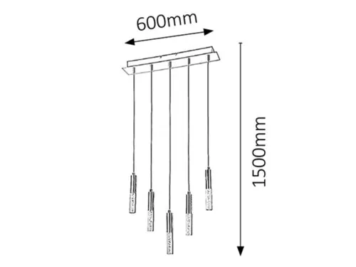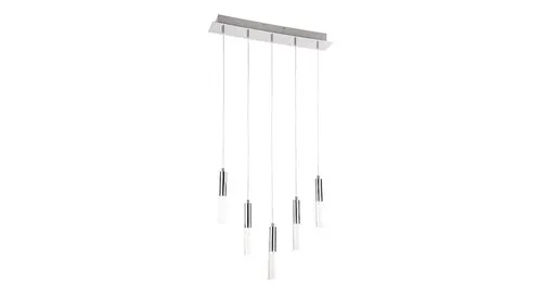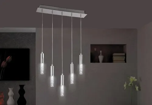 Exkluzív megjelenésű függeszték beépített energiatakarékos LED fényforrásokkal. 150 cm lelógású, 60 cm széles, króm színű fém lámpatest és áttetsző műanyag lámpabúrák, buborékos kialakítással. A beépített fényforrások 5x 5W teljesítmény mellett 400 lumenes fényerőt és 3000 Kelvines, melegfehér színű fényt biztosítanak. A lámpatestbe beépített fényforrások nem cserélhetők. 5 év garanciával.