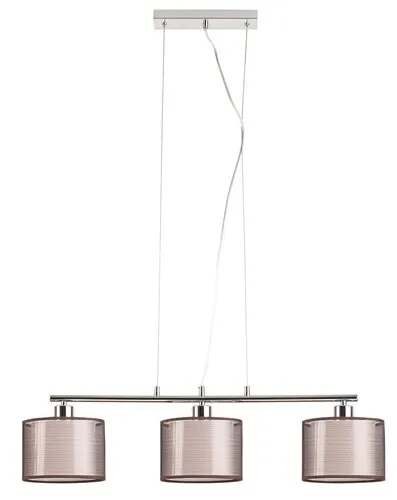 Időtlen megjelenésű függeszték 3 db foglalattal. 100 cm lelógású, 80 cm széles, króm színű fém lámpatest valamint barna és fehér színkombinációjú textil lámpabúra. A függeszték E-27-es foglalatú, max. 3x 60W teljesítményű energiatakarékos fényforrásokkal is használható.