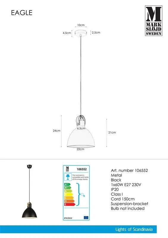 MARKSLÖJD EAGLE Beltéri függeszték E27 60W fekete