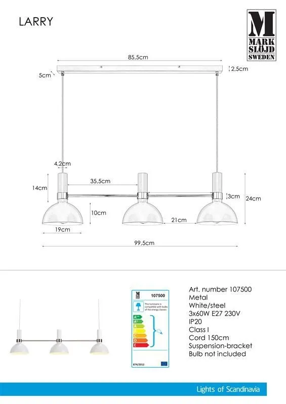 Markslöjd LARRY Beltéri függeszték E27 3x60W fehér