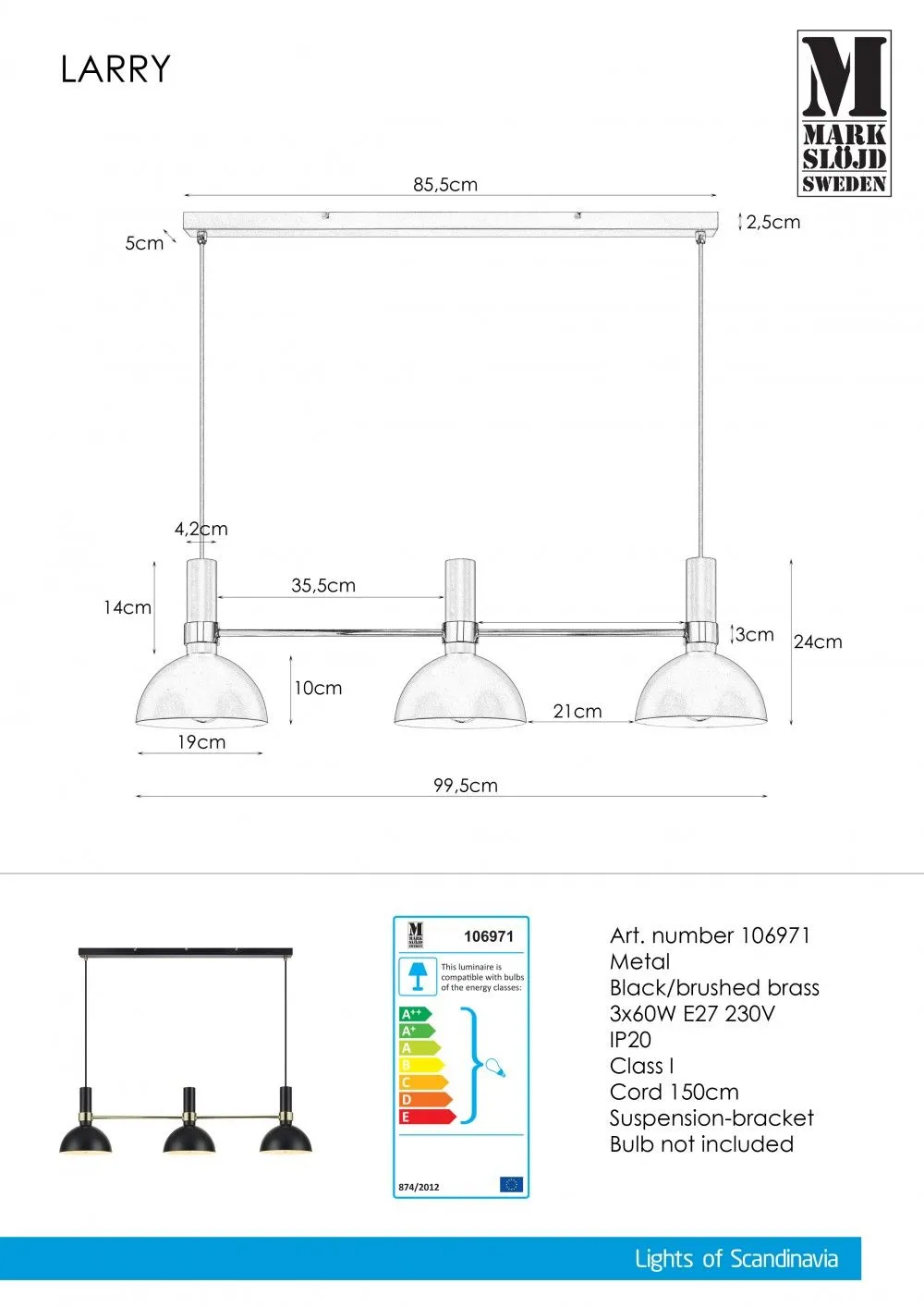 MARKSLÖJD LARRY függeszték 3L fekete/csiszolt sárgaréz