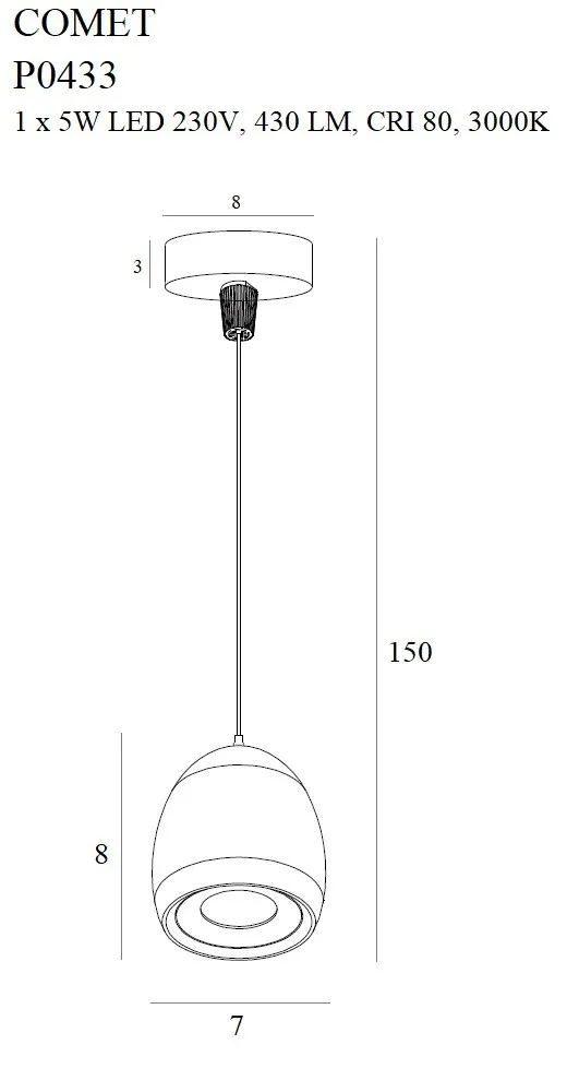 Moc/Power: 1 x 5W LED 230V, 430 LM, CRI 80, 3000K_x000D_ H: max 150 cm, Ă: 7,0 cm, h: 8,0 cm_x000D_ WykoĹ„czenie/Detail finishing: czarne/black_x000D_ MateriaĹ‚/Material: metal,metal_x000D_ KÄ…t Ĺ›wiecenia/beam angle: 36°_x000D_ LED w komplecie/LED included 3000K
