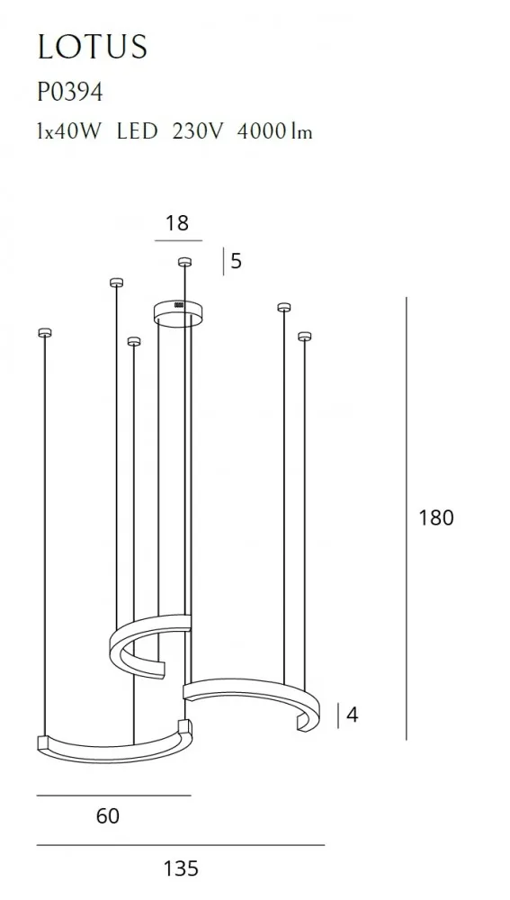 Moc/Power: 1 x 40W LED, 4000 LM_x000D_, CRI90 3000K_x000D_H: max 180 cm, Ă: 135 cm_x000D_Podsufitka/canopy: Ă 18 cm, H: 5,0 cm_x000D__x000D__x000D_WykoĹ„czenie/Detail finishing: zĹ‚ote/gold_x000D_MateriaĹ‚/Material: stal nierdzewna, akryl/stainless steel, acrylic_x000D_Zasilacz + LED Ĺ›ciemnialny w komplecie/ Triac dimmable LED + driver included_x000D_nie zawiera Ĺ›ciemniacza Ĺ›ciennego/ wall dimmer not included