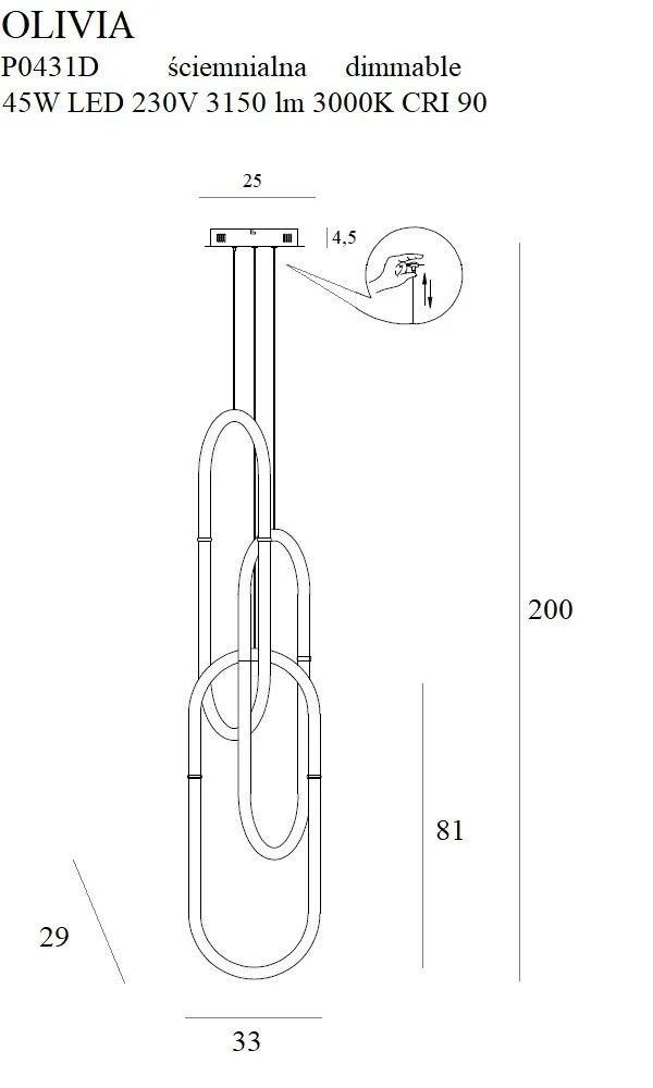 Moc/Power: 3 x 15 W LED 230V, 3150 LM, CRI 90, 3000K_x000D_ W: 33 cm, D: 29 cm, H: 200 cm, h: 81_x000D_ Wykończenie/Detail finishing: złote/gold_x000D_ Materiał/Material: stal nierdzewna, szkło acrylowe, silikon/ stainless steel, acrylic glass, silicon_x000D_ Zasilacz + LED ściemnialny w komplecie/ Triac dimmable LED + driver included_x000D_ nie zawiera ściemniacza ściennego/ wall dimmer not included
