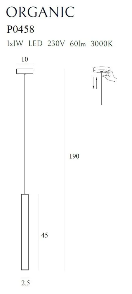 Moc/Power: 1 x 1W LED 230V, 60 LM, CRI90 3000K_x000D_ H: max 190 cm, Ă: 2,5 cm_x000D_ WykoĹ„czenie/Detail finishing: miedĹş szczotkowana/brushed copper_x000D__x000D_ MateriaĹ‚/Material: stal nierdzewna, akryl/ stainless steel_x000D__x000D_, acrylic_x000D__x000D_ LED w komplecie/LED included 3000K