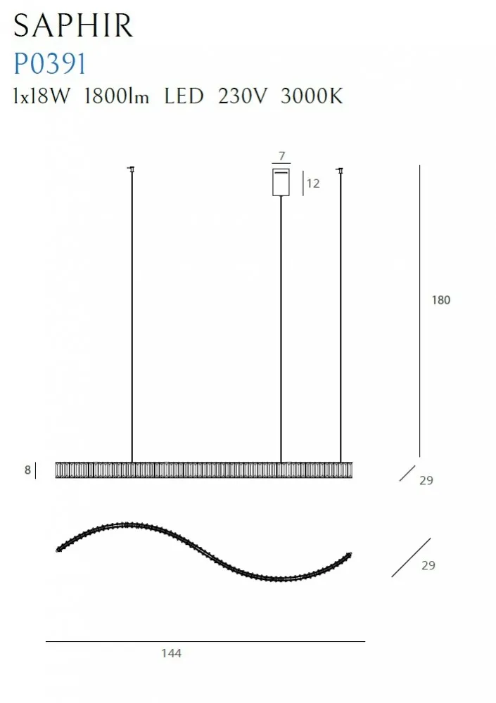 Moc/Power: 1 x 18W, 1800 LM_x000D_, CRI90 3000K W: 144 cm, D:29 cm, H: 180 cm_x000D_ Materiał/Material/: stal nierdzewna, kryształ K9/ stainless steel, K9 crystal_x000D__x000D_ Wykończenie/Detail finishing: chrom/chrome_x000D_ LED w komplecie/LED included 3000K