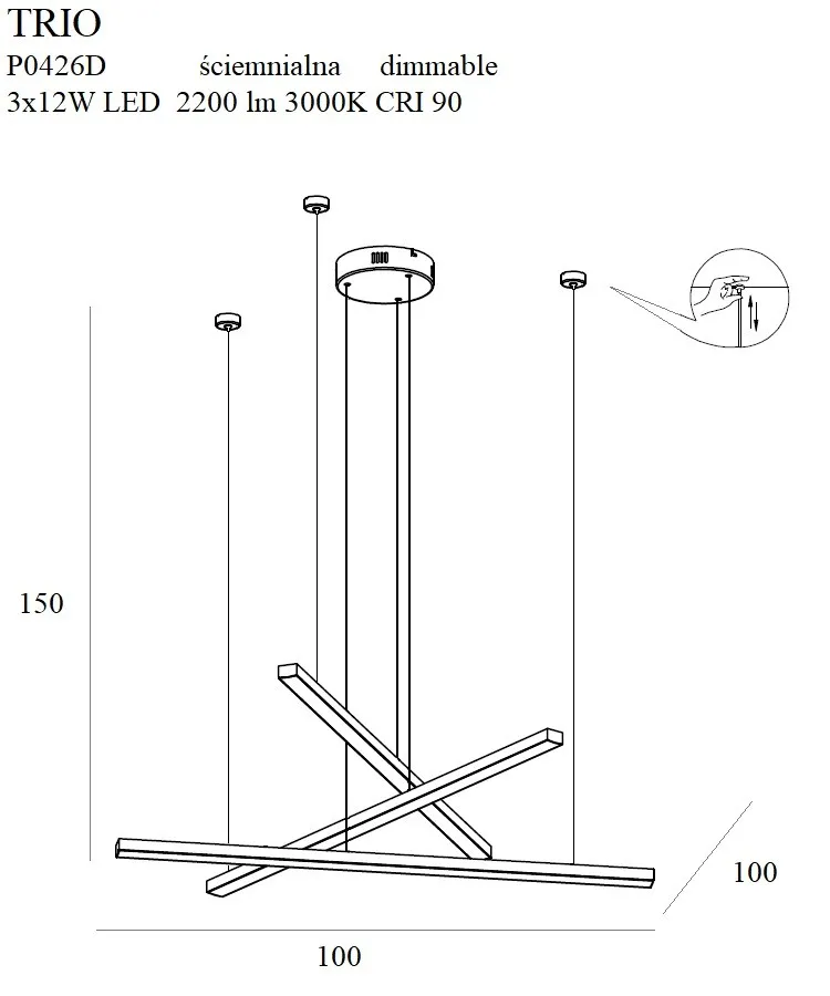 Moc/Power: 3 x 12W LED 230V, 2200 LM, CRI90 3000K_x000D_ W: 100 cm, D: 100 cm, H: max 150 cm _x000D_ Wykończenie/Detail finishing: złote/gold_x000D__x000D_ Materiał/Material: stal nierdzewna, akryl/stainless steel, acrylic_x000D_ Zasilacz + LED ściemnialny w komplecie/ Triac dimmable LED + driver included_x000D_ nie zawiera ściemniacza ściennego/ wall dimmer not included
