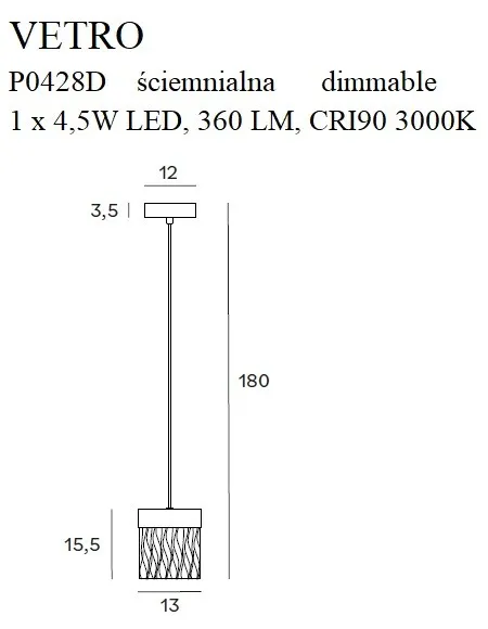 Moc/Power: 1 x 4,5W LED 230V, 360 LM, CRI 90, 3000K_x000D_ W: 13 cm, D: 2,2 cm, H: max 180 cm, h: 15,5 cm_x000D_ Wykończenie/Detail finishing: złote/gold_x000D_ Materiał/Material: stal nierdzewna, szkło/ stainless steel, szkło _x000D_ Zasilacz + LED ściemnialny w komplecie/ Triac dimmable LED + driver included_x000D_ nie zawiera ściemniacza ściennego/ wall dimmer not included