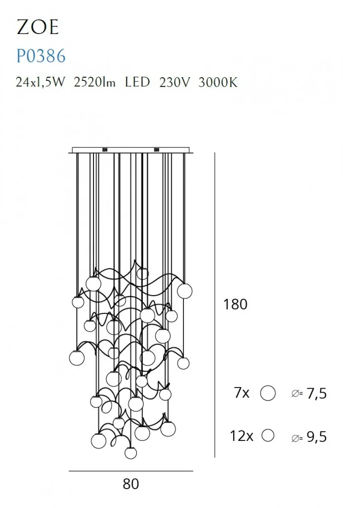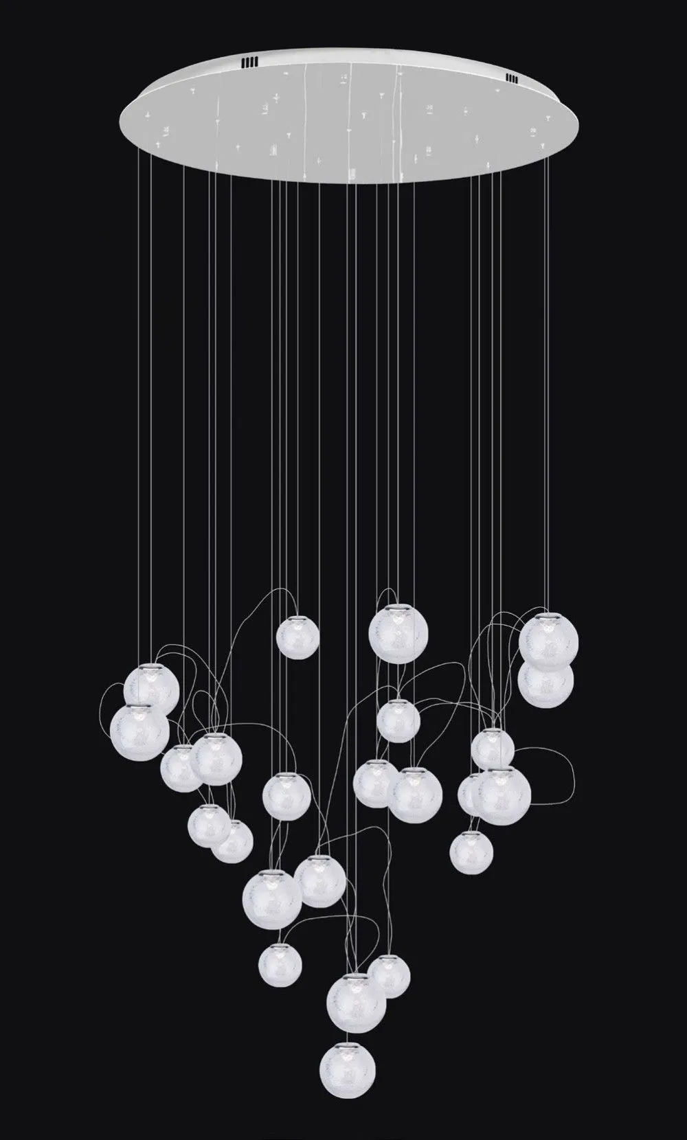 Moc/Power: 24 x 1,5W LED, 2520 LM_x000D_, CRI90 3000K_x000D_H: max 180 cm, Ă: 80 cm, Ă shade: 7,5 cm x 7szt + 9,5 cm x 12szt._x000D__x000D_MateriaĹ‚/Material/: stal nierdzewna, transparentne szkĹ‚o z bÄ…belkami/ _x000D__x000D_stainless steel, clear bubble glass_x000D__x000D__x000D_WykoĹ„czenie/Detail finishing: chrom/chrome_x000D__x000D_LED w komplecie/LED included 3000K