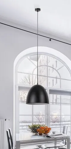 Indusztriális stílusú függeszték 1 db foglalattal. 125 cm lelógású, 30 cm átmérőjű, fekete színű, fémből készített test és lámpabúra. A lámpatest E27-es foglalatkialakítású, max. 60W teljesítményű energiatakarékos fényforrással is használható.
