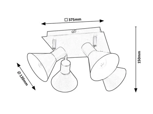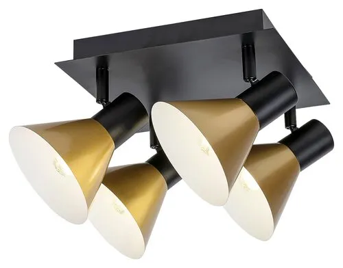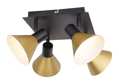 A modern stílusú Alvaro négyes spotlámpa a lakás számos helyiségébe jó választás lehet: felszerelhetjük a nappaliban, a hálószobában, de az étkezőben vagy akár a konyhában is. A matt fekete és arany színkombinációban készült fémlámpát lefelé szélesedő, alul nyitott búrák teszik teljessé. Az Alvaro nagyméretű, szögletes dísztalp segítségével rögzíthető a mennyezetre. A lámpa négy darab, egyenként legfeljebb 40 W teljesítményű fényforrással használható, a foglalatok típusa E14. Ízlésünktől és a felszerelés helyétől függően választhatunk hozzá meleg vagy természetes fehér fényű fényforrásokat. Az állítható lámpafejeknek köszönhetően a lámpa fényét igény szerint irányíthatjuk és hatékonyan bevilágíthatjuk az egész helyiséget. Az Alvaro négyes spot lámpa mérete 375x375 mm, egy-egy búra átmérője 120 mm, a lámpa mennyezettől mért távolsága 150 mm. Ezt a modellt fényforrások nélkül szállítjuk.