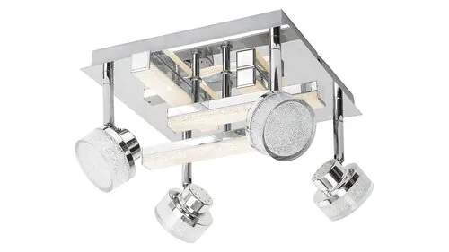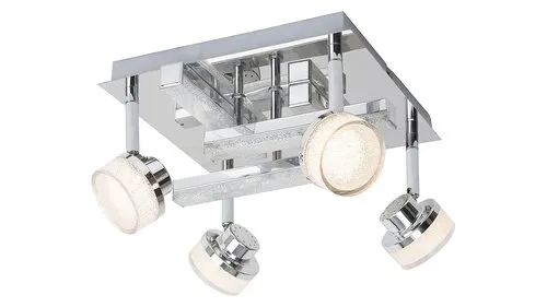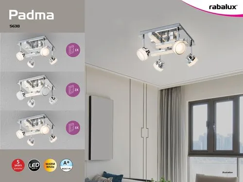 A króm és átlátszó kristály színkombinációban készült Padma négyes spotlámpát azoknak ajánljuk, akik kedvelik a nem hétköznapi, figyelemfelkeltő megoldásokat. Ez a modell különleges darabja lehet modern nappalink vagy előszobánk berendezésének. A mennyezeti lámpa fém testét cukrozott műanyag búrák illetve spot pálcikák egészítik ki, melyek igazán egyedi megjelenést kölcsönöznek ennek a modellnek. A Padma összesen 8 db beépített, energiatakarékos LED fényforrással rendelkezik. A cukrozott búrák alatt megbúvó fényforrások teljesítménye együtt 20 W, fényerejük 1600 lumen. Ezeket egészíti ki a pálcikákban rejtőző 4 db, összesen 12 W-os fényforrás, melyek 640 lumen fényerővel bírnak. A fényforrások élettartama 20 000 óra, színhőmérsékletük pedig 3000 K, azaz meleg fehér fényt sugároznak. A lámpa két része külön-külön kapcsolható. Az extravagáns Padma négyes spot lámpa mérete 290x290 mm, mennyezettől való távolsága 150 mm. Erre a modellre 5 év garanciát vállalunk.