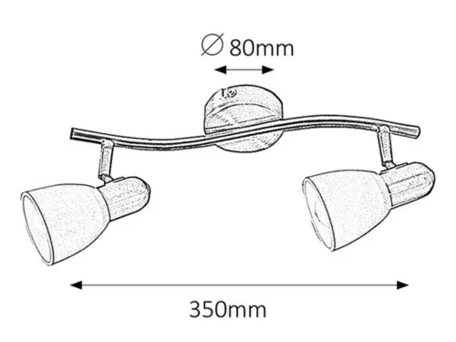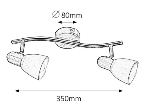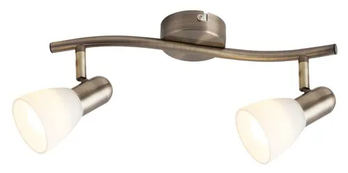 Időtlen stílusú mennyezeti lámpa, 2 darab foglalattal. 35 cm széles, bronz színű fém szerkezet és pozícionálható, fehér színű üvegbúrák, IP20-as védelemmel. A lámpatest E14-es foglalatú, max. 2x 40W teljesítményű, halogén vagy energiatakarékos fényforrásokkal is működtethető.