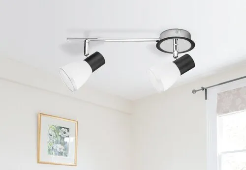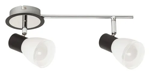 Modern megjelenésű mennyezeti spotlámpa 2 db foglalattal. 33,5 cm széles, fekete és króm színkombinációjú fém lámpatest és pozícionálható üveg lámpabúrák. A lámpatest E-14-es foglalatú, max. 2x 40W teljesítményű energiatakarékos fényforrásokkal is használható.