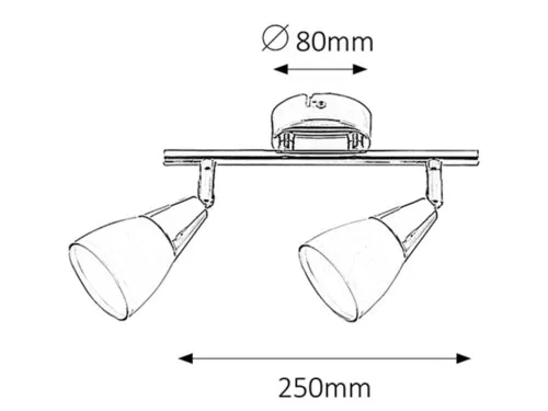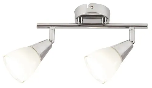 Modern megjelenésű mennyezeti spotlámpa 2 db foglalattal. 25 cm széles, króm színű fém lámpatest és pozícionálható, fehér színű üveg lámpabúrák, IP20-as védelemmel. A lámpatest E-14-es foglalatú, max. 2x 40W teljesítményű energiatakarékos fényforrásokkal is használható.