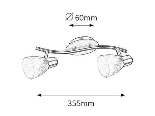 A kortalan stílusú spotlámpa, 2 darab foglalattal. 35.5 cm széles, szatin króm színű fém szerkezet és pozícionálható, fehér alapszínű, mintás üvegbúrák, IP20-as védelemmel. A lámpatest E14-es foglalatú, max. 2x 40W teljesítményű, halogén vagy energiatakarékos fényforrásokkal is használható.