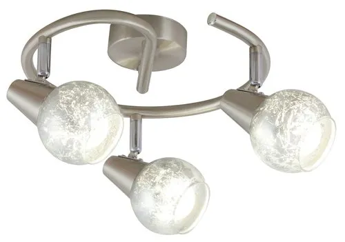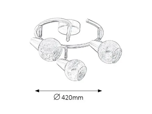 Modern megjelenésű mennyezeti spotlámpa 3 db foglalattal. 42 cm átmérőjű, szatin króm színű fém lámpatest pozícionálható, ezüst fóliázott üveg lámpabúrákkal, IP20-as védettséggel. A lámpatest E-14-es foglalatkialakítású, 3x max. 25W teljesítményű, energiatakarékos izzókkal is használható.