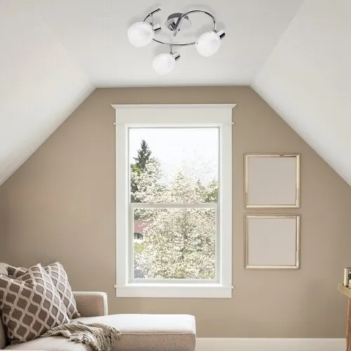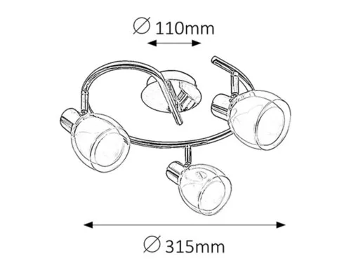 Modern megjelenésű mennyezeti spotlámpa 3 db foglalattal. 31,5 cm átmérőjű, króm színű fém lámpatest és pozícionálható, fehér és áttetsző színkombinációjú üveg lámpabúrák. A lámpatest E-14-es foglalatú, max. 3x 40W teljesítményű energiatakarékos fényforrásokkal is használható.