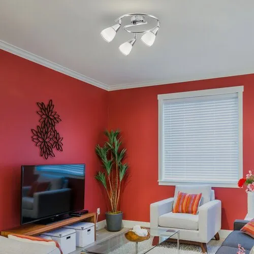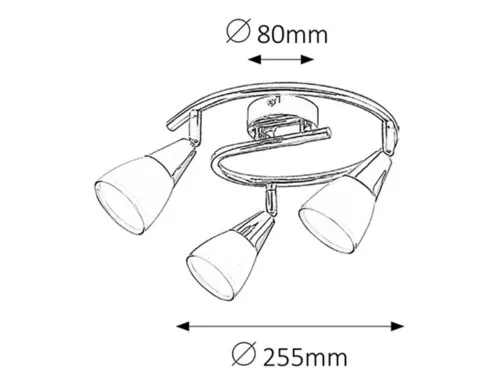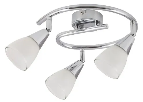 Modern megjelenésű mennyezeti spotlámpa 3 db foglalattal. 25,5 cm átmérőjű, króm színű fém lámpatest és pozícionálható, fehér színű üveg lámpabúrák, IP20-as védelemmel. A lámpatest E-14-es foglalatú, max. 3x 40W teljesítményű energiatakarékos fényforrásokkal is használható.