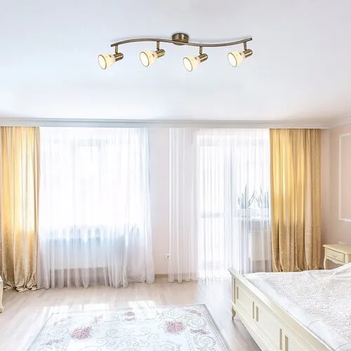 Kézzel festett, egyedi megjelenésű spotlámpa 4 darab foglalattal. 70 cm széles, bronz színű fémből készített szerkezettel, bronz mintás alabástrom üvegbúrákkal, IP20-as védelemmel. A lámpatest E14-es foglalatú, max. 4x 40W teljesítményű, halogén vagy LED fényforásokkal is használható.