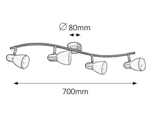 Időtlen stílusú spotlámpa, 4 darab foglalattal. 70 cm széles, bronz színű fém szerkezet és pozícionálható, fehér színű üvegbúrák, IP20-as védelemmel. A lámpatest E14-es foglalatú, max. 4x 40W teljesítményű, halogén vagy energiatakarékos fényforrásokkal is működtethető.