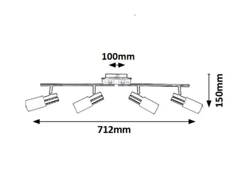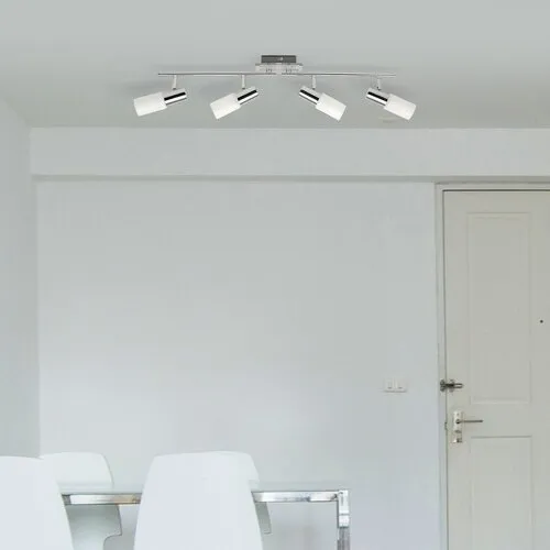 Modern megjelenésű mennyezeti spotlámpa 4 db foglalattal. 71,2 cm széles, króm és szatin króm színű fém szerkezettel és pozícionálható, fehér üvegbúrákkal szerelt lámpatest. A modell E-14-es foglalatú, max. 4x40W teljesítményű, halogén vagy energiatakarékos fényforrásokkal használható.