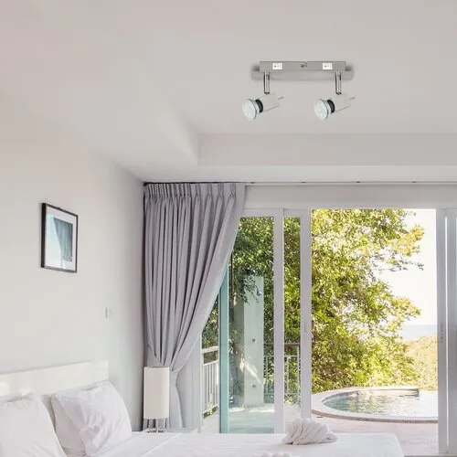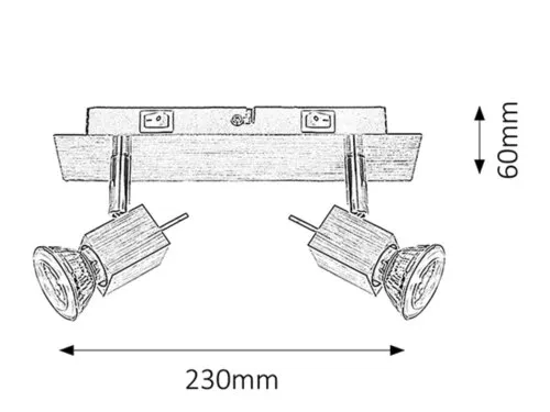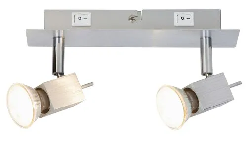 Modern megjelenésű, falra szerelhető spotlámpa 2 db energiatakarékos LED fényforrással és hálózati kapcsolóval. 23 cm széles, súrolt alumínium színű, fémből készített lámpatest pozícionálható búrákkal. A lámpatestben elhelyezett fényforrások A+ energiaosztályú besorolás és 2x 5W teljesítmény mellett 2x 400 lumenes fényerőt és 3000 Kelvines, melegfehér színű fényt biztosítanak. Fényforráscsere esetén a lámpatest GU10-es foglalatú, max. 2x 50W teljesítményű fényforrásokkal használható.