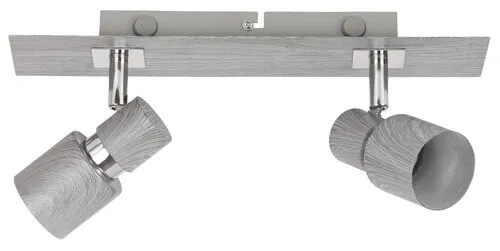 Modern megjelenésű fali spotlámpa 2 db foglalattal, beépített kapcsolókkal. 32 cm széles, szürke tölgy és króm színű, fémből készített lámpatest és pozícionálható lámpabúrák. A lámpatest GU10-es foglalatú, max. 2x 50W teljesítményű energiatakarékos fényforrásokkal is használható.